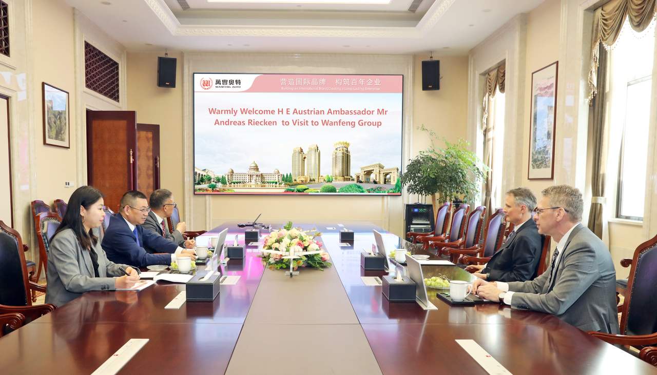 4月10日,奥地利驻华大使Andreas Riecken、商务参赞Franz Rossler到访万丰考察调研,万丰集团董事局主席陈爱莲进行了交流座谈。
